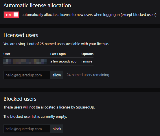 You can switch Automatic license allocation to off if you do not want licenses to be allocated to any Azure AD user as they log in to SquaredUp DS. You can then remove particular usernames from the list and add other usernames to pre-populate or 'whitelist' who is allowed log on.