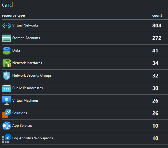 The Summary Grid visualization allows you to show a table representation of the total number of resources for the scope and grouping you have specified. You can also group and sort the table.