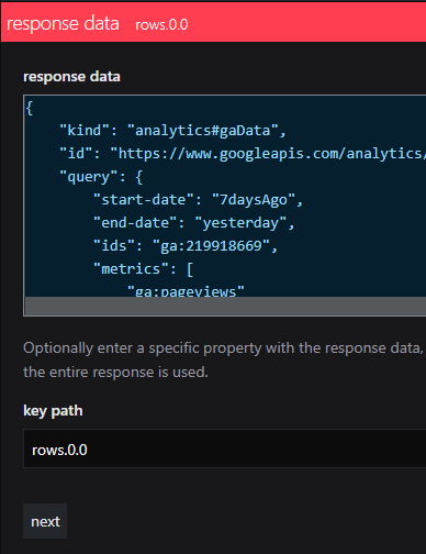 https://www.googleapis.com/) from the API Query URI section, so you have something like the following:/analytics/v4/data/ga?ids=ga%3A5###ACCOUNTID###&start-date=30daysAgo&end-date=yesterday&metrics=ga%3Apageviews - Paste this URL into the http modeURL box on your SquaredUp DS dashboard.