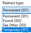 - Change the Redirect type from Permanent (301) to Temporary (307). A Temporary redirect is preferred as it doesn't allow the HTTP Method to be changed as part of the redirect, and it is well supported by different browsers.