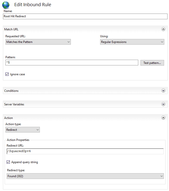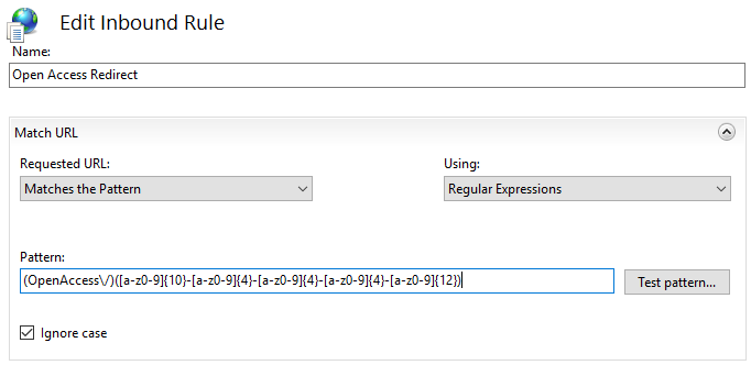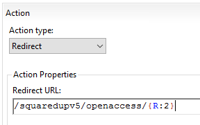 - The Inbound Rule should look like this: Pattern: (OpenAccess\/)([a-z0-9]{10}-[a-z0-9]{4}-[a-z0-9]{4}-[a-z0-9]{4}-[a-z0-9]{12}) Action Type: Redirect Redirect URL: /squaredup/openaccess/{R:2} Redirect type: Temporary (307)