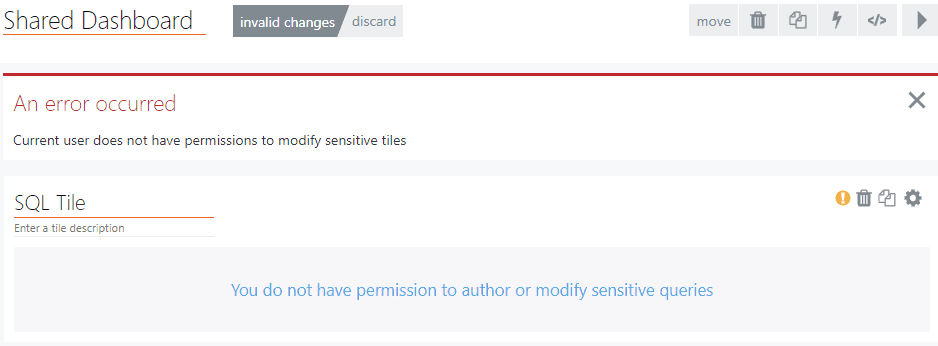After making disallowed edits to a sensitive query any change (to the query or the rest of the dashboard) cannot be saved. Any further changes to the rest of the dashboard made after the disallowed edits to the sensitive query will also be lost. The user has to click the invalid changes button and then discard to discard the disallowed changes.