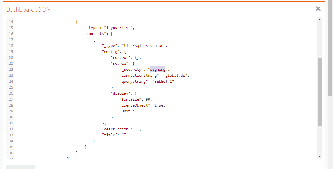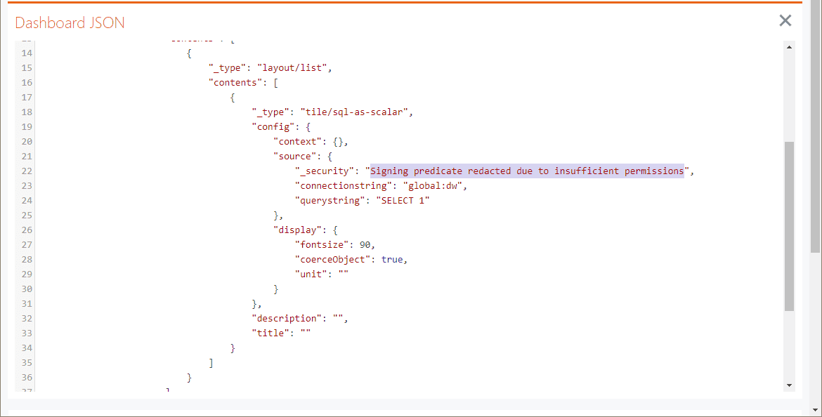 - Only for version 4.4 and below: Giving a user permission to sign tiles does not affect dashboards that have already been authored by that user. If a user already authored sensitive tiles and caused them to be untrusted, the signing of those tiles must be restored. This can be done by either deleting and re-creating individual tiles or the entire dashboards, or by restoring the signing in the JSON of the affected tiles. - To restore the dashboard to working order for all users, an administrator can modify the JSON of the dashboard to re-enter - signinginto the- _securityfield of the relevant tile(s) and publish the result:- Enter edit mode of the dashboard with the affected tile.