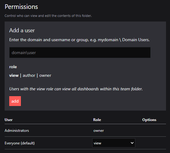 If you are using Team Folders, you can allow SquaredUp DS users to edit dashboards in a Team Folder by giving them the Author or Owner role for it. Being able to edit tiles in a dashboard means the user also has access to sensitive tiles:
