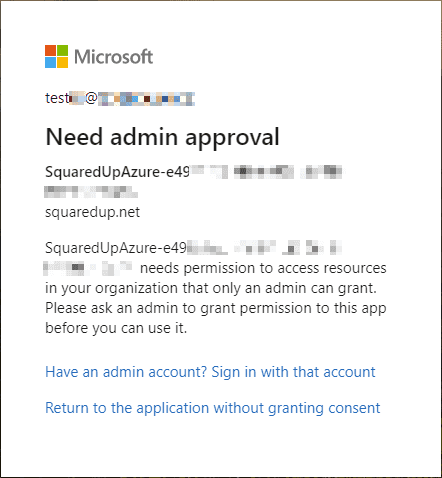 Users logging in to SquaredUp DS for the first time may see the message Need admin approval if an administrator did not tick Consent on behalf of your organization at the permissions requested stage of SquaredUp DS deployment (see Troubleshooting users being unable to logon). An administrator needs to give consent in the Azure portal as described below: