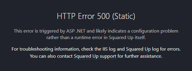 "This error is triggered by ASP.NET and likely indicated a configuration problem rather than a runtime error in SquaredUp itself"