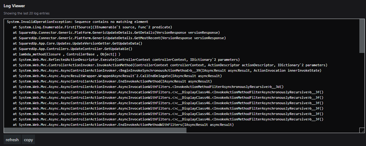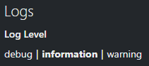 SquaredUp Support may ask you to increase the logging level to Debug if they need more information to be recorded for troubleshooting. Alternatively, you may choose to decrease the logging level to warning if you wish to record less information, and reduce the file size of the logs.