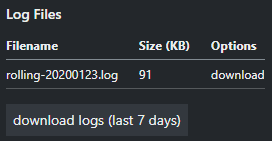 The Log Files section shows the most recent log files, up to 10 days old, which can be downloaded individually. The download logs button automatically downloads the last 7 days worth of logs.