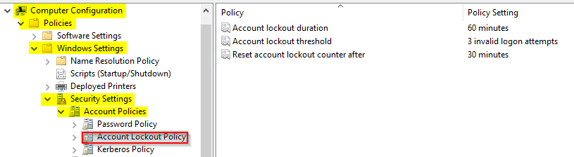 - In the domain, go to Computer Configuration\Policies\Windows Settings\Security Settings\Account Policies\Account Lockout Policy.