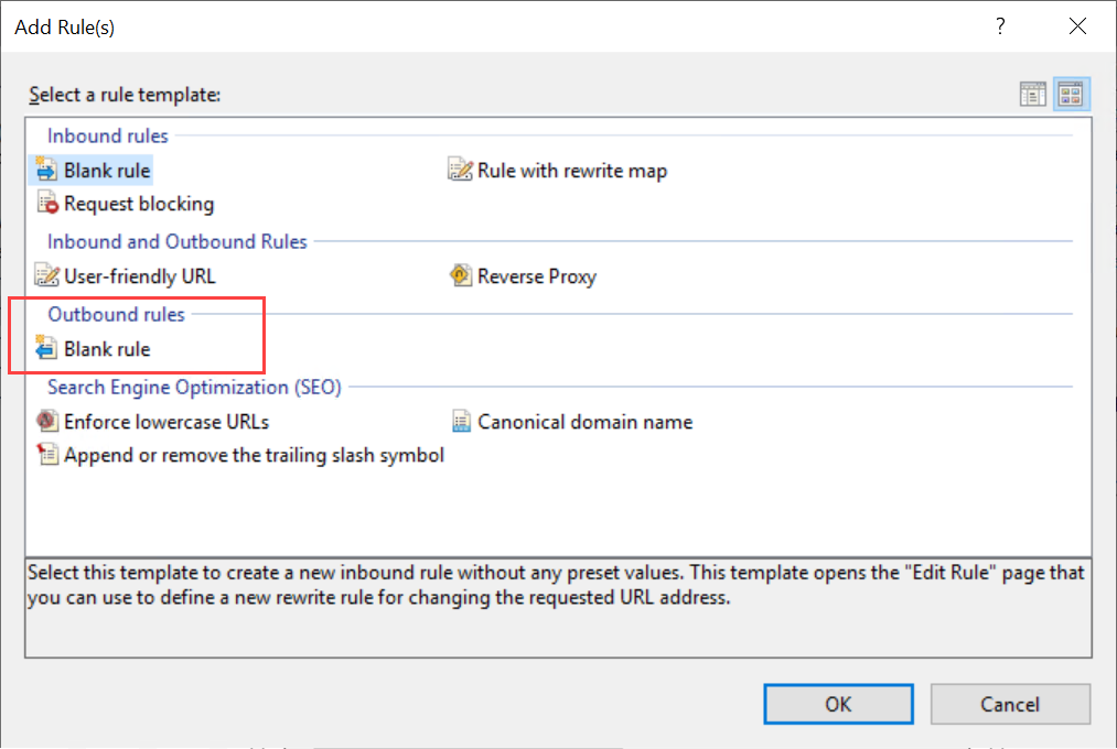 - Create 3 new rules, one for each header you want to remove. Choose Outbound rules > Blank rule for each rule.