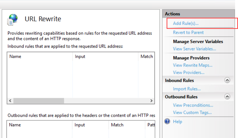 - Click on Add rule(s) in the Actions panel on the right hand side.