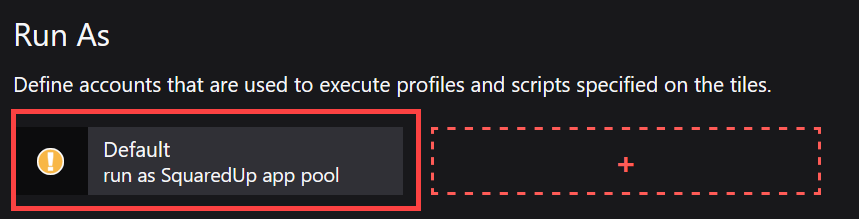 Every PowerShell tile needs a Run As and if you haven't created a Run As yet, tiles will use the Default Run As. The Default Run As uses the SquaredUp DS app pool to run scripts. The SquaredUp DS app pool account might grant too many permissions that are not needed for your scripts and can potentially damage your system, which is why using this default account is not recommended. Create a service account that you want to use for the Default Run As and change the Default Run As to use those credentials.