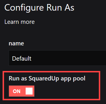 - Switch the Run as SquaredUp DS app pool toggle to off.