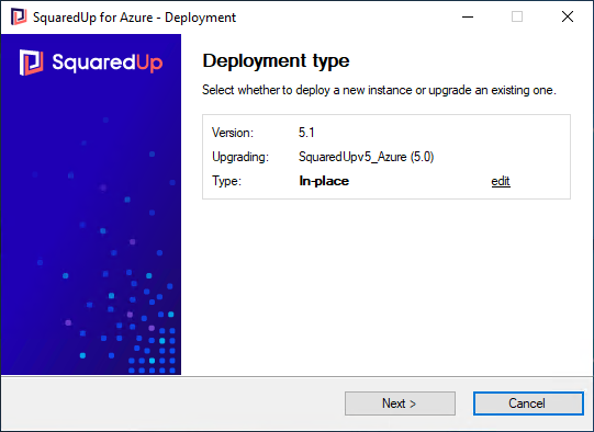 - Leave the default install type as In-Place. Check the correct SquaredUp DS instance is going to be upgraded. You can click edit to see more details.